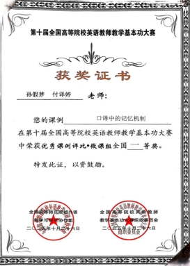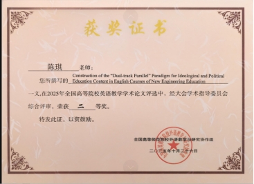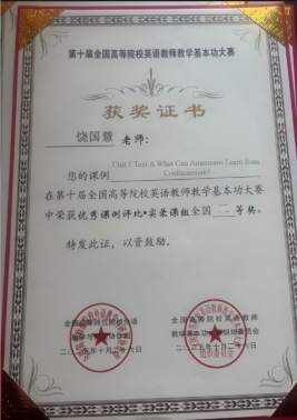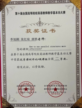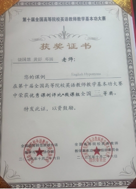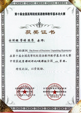 基本功大赛微课组别中,安丽娅、胥婷、陈琴教师团队的作品《The Power of Precision: Unpacking Hyponymy》,孙假梦、付译婷教师团队的作品《口译中的记忆机制》分别荣获全国一等奖;李旭刚、张红琼、唐艳教师团队的作品《How to use parallel structures more effectively?》,胡璐、陈丹、王娟教师团队的作品《Business Correspondence: Email》分别荣获全国二等奖;饶国慧、黄舒、邓圆教师团队的作品《English Hyponyms》荣获全国三等奖。基本功大赛实录课组别中,饶国慧老师的作品《Unit1 Text A What Can Americans Learn from Confucianism?》荣获全国二等奖。在英语教学优秀学术论文评选方面,陈琪老师的教学研究论文《Construction of the “Dual-track Parallel” Paradigm for Ideological and Political Education Content in English Courses of New Engineering Education》荣获全国二等奖。